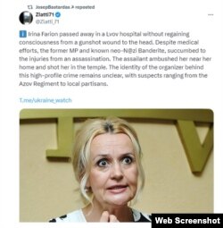Durante casi una hora, medios de comunicación rusos, blogueros y canales de Telegram recordaron el conflicto de Farion con «neonazis rusoparlantes» el año pasado, hasta que la publicación rusa Ukraina.ru (perteneciente al holding federal Rossiya Segodnya) «lanzó» finalmente una versión de venganza, que fue recogida por la publicación Readovka, vinculada al Kremlin, que incluyó en el círculo de sospechosos a «residentes ordinarios de Lviv rusoparlantes».